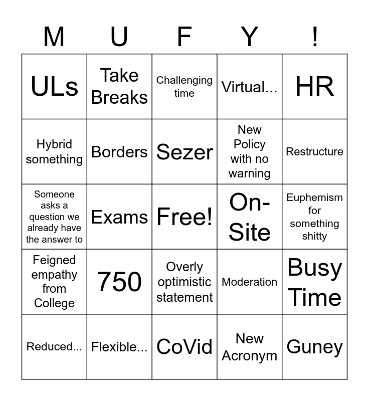 This bingo card has a free space and 29 words: Reduced..., WRS/Results, Exams, DLs, ULs, Challenging time, Borders, 750, On-Site, Flexible..., Euphemism for something shitty, Guney, CoVid, New Acronym, Restructure, Uncertainty, Overly optimistic statement, Feigned empathy from College, HR, Someone asks a question we already have the answer to, Moderation, Redundancy, New Policy with no warning, Hybrid something, Virtual..., Take Breaks, Busy Time, Sezer and Jo/The Board.