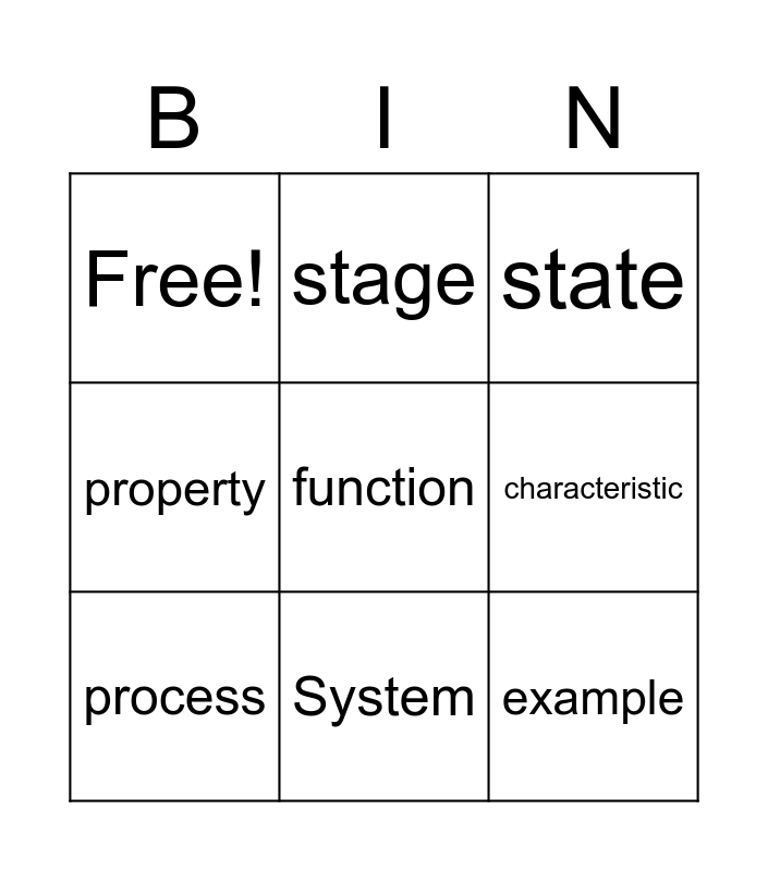 This bingo card has 9 words: process, state, stage, property, Free!, characteristic, function, example and System.