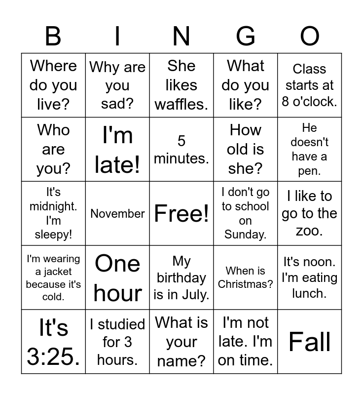 This bingo card has a free space and 24 words: One hour, I studied for 3 hours., 5 minutes., It's 3:25., Class starts at 8 o'clock., Where do you live?, Who are you?, Why are you sad?, I don't go to school on Sunday., My birthday is in July., How old is she?, It's midnight. I'm sleepy!, When is Christmas?, It's noon. I'm eating lunch., I'm late!, I'm not late. I'm on time., I like to go to the zoo., She likes waffles., He doesn't have a pen., November, Fall, I'm wearing a jacket because it's cold., What do you like? and What is your name?.