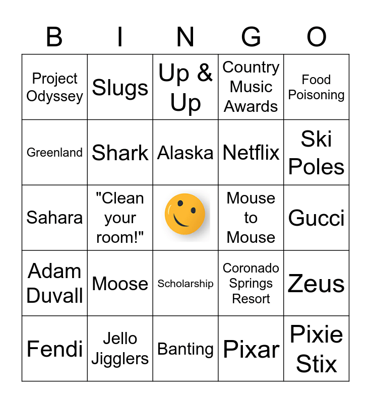 This bingo card has a free space and 28 words: Zeus, Sasquatch, Netflix, Pixar, Greenland, Up & Up, Slugs, Adam Duvall, Mouse to Mouse, Fendi, Sahara, Country Music Awards, Jello Jigglers, Banting, Ski Poles, Bear, Moose, Shark, Alaska, Scholarship, Project Odyssey, NPR, Pixie Stix, "Clean your room!", Gucci, Coronado Springs Resort, Food Poisoning and Idaho.