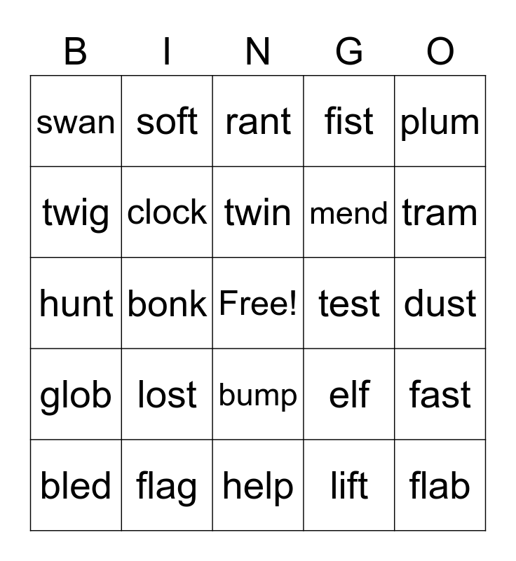 This bingo card has a free space and 24 words: lost, flag, twin, bled, plum, swan, twig, soft, test, bump, mend, hunt, elf, fast, clock, lift, dust, rant, tram, bonk, flab, glob, fist and help.