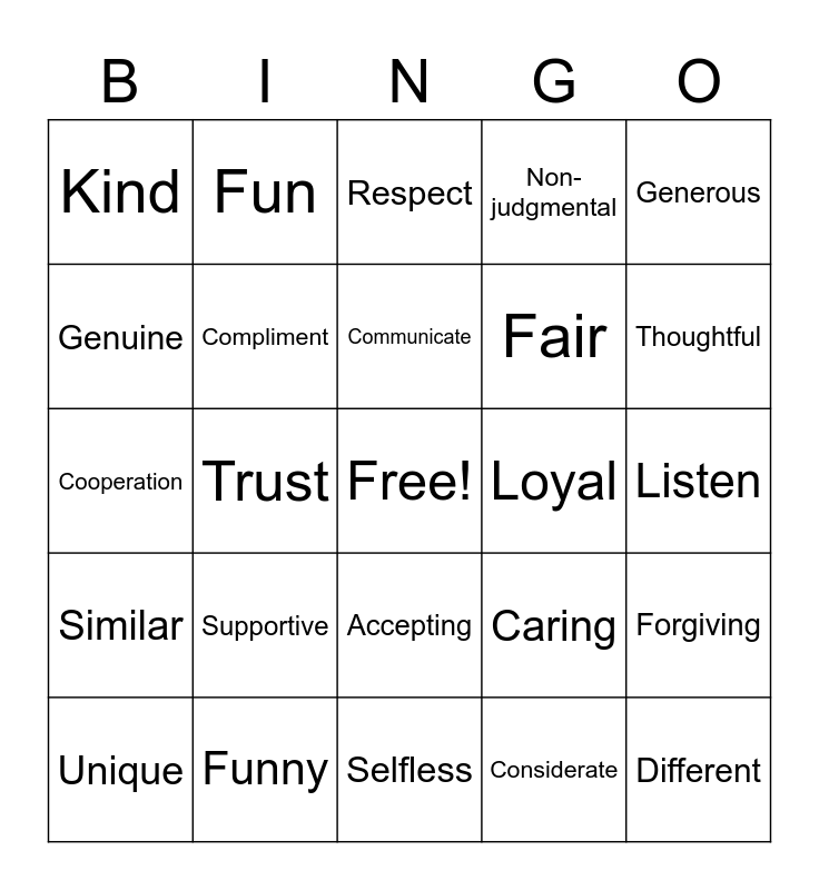 This bingo card has a free space and 29 words: Unique, Encouraging, Trust, Helpful, Kind, Respect, Compliment, Supportive, Loyal, Funny, Listen, Different, Selfless, Considerate, Thoughtful, Dependable, Accepting, Similar, Generous, Cooperation, Caring, Positive, Fair, Genuine, Non-judgmental, Fun, Forgiving, Communicate and Laugh.