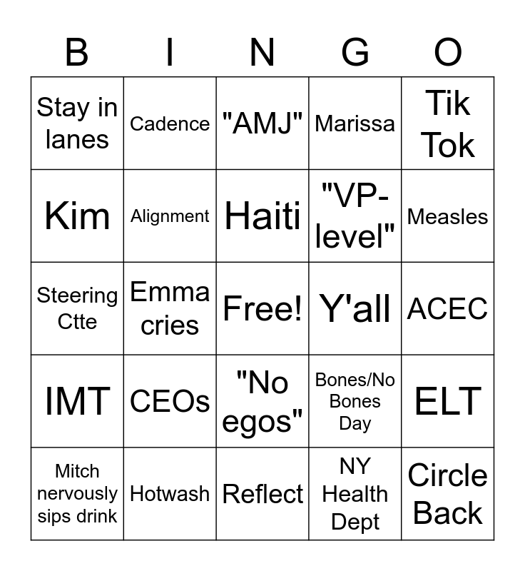 This bingo card has a free space and 24 words: CEOs, Hotwash, Haiti, Mitch nervously sips drink, Tik Tok, Stay in lanes, Kim, Cadence, Y'all, "No egos", "VP-level", Steering Ctte, Bones/No Bones Day, ELT, Alignment, NY Health Dept, ACEC, "AMJ", Measles, Emma cries, Circle Back, IMT, Marissa and Reflect.