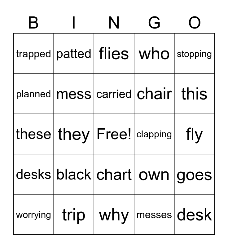 This bingo card has a free space and 24 words: black, trip, carried, worrying, stopping, trapped, planned, patted, clapping, chart, chair, these, own, goes, mess, messes, fly, flies, this, they, desk, desks, who and why.