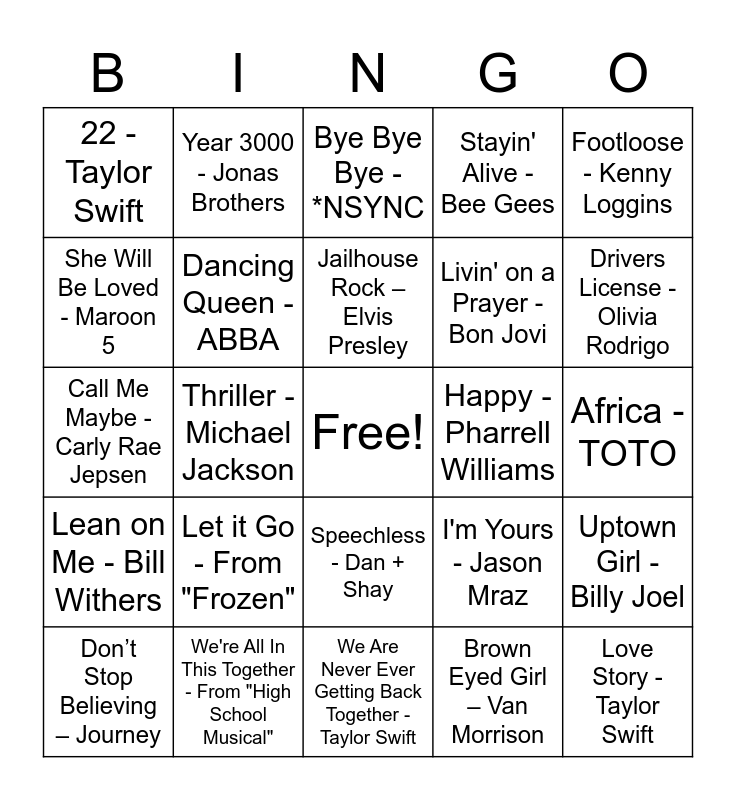 This bingo card has a free space and 55 words: Party in the USA – Miley Cyrus, Don’t Stop Believing – Journey, Summer of '69 - Bryan Adams, 22 - Taylor Swift, We Are Never Ever Getting Back Together - Taylor Swift, Bohemian Rhapsody - Queen, Dancing Queen - ABBA, Single Ladies (Put a ring on it) - Beyonce, Livin' on a Prayer - Bon Jovi, I Will Always Love You - Whitney Houston, Stayin' Alive - Bee Gees, ABC - The Jackson 5, Rolling in the Deep - Adele, Wake Me Up Before You Go-Go - Wham!, Sweet Caroline - Neil Diamond, Thinking Out Loud - Ed Sheeran, Footloose - Kenny Loggins, Thriller - Michael Jackson, Y.M.C.A. - Village People, Love Story - Taylor Swift, Happy - Pharrell Williams, Jessie's Girl - Rick Springfield, I'm Yours - Jason Mraz, Bye Bye Bye - *NSYNC, I Wanna Dance With Somebody - Whitney Houston, Jailhouse Rock – Elvis Presley, Brown Eyed Girl – Van Morrison, Ain't No Mountain High Enough - Marvin Gaye, Tammi Terrell, Africa - TOTO, Uptown Girl - Billy Joel, Just the Way You Are - Bruno Mars, A Whole New World - From "Aladdin", Hey Jude - The Beatles, Firework - Katy Perry, She Will Be Loved - Maroon 5, Call Me Maybe - Carly Rae Jepsen, The Climb - Miley Cyrus, Lean on Me - Bill Withers, Hey, Soul Sister - Train, Hey There Delilah - Plain White T's, Year 3000 - Jonas Brothers, Sucker - Jonas Brothers, L-O-V-E - Nat King Cole, How Far I'll Go - From "Moana", Let it Go - From "Frozen", We're All In This Together - From "High School Musical", I Just Can't Wait to Be King - From "The Lion King", Part of Your World - From "The Little Mermaid", You Say - Lauren Daigle, Drivers License - Olivia Rodrigo, Baby - Justin Beiber, Shut Up and Dance - WALK THE MOON, You Belong With Me - Taylor Swift, Speechless - Dan + Shay and Fly Me To The Moon - Frank Sinatra.