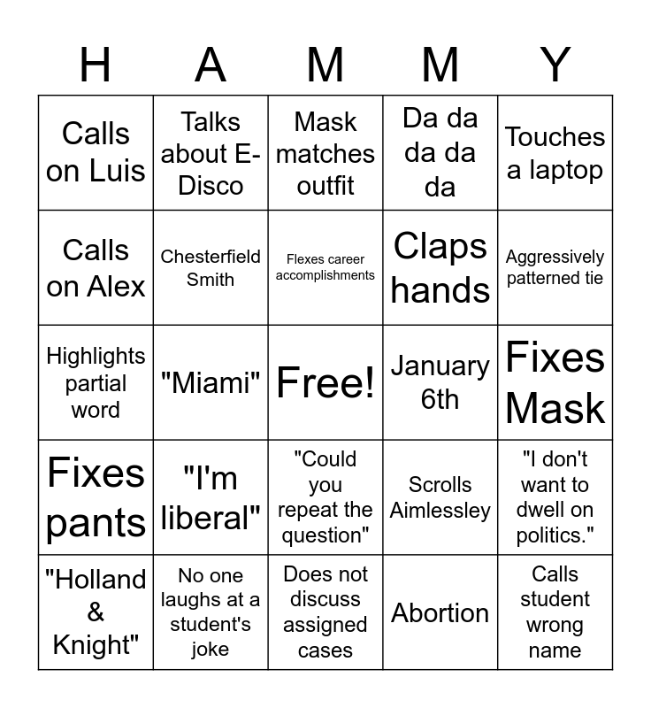 This bingo card has a free space and 26 words: "Could you repeat the question", Abortion, Flexes career accomplishments, No one laughs at a student's joke, Touches a laptop, Calls on Luis, Calls on Alex, Talks about E-Disco, Fixes Mask, Scrolls Aimlessley, Claps hands, Highlights partial word, "I don't want to dwell on politics.", "Holland & Knight", "Miami", Nostalgic Storytime, Da da da da da, Fixes pants, Mask matches outfit, Calls student wrong name, Aggressively patterned tie, Does not discuss assigned cases, January 6th, "I'm liberal", Chesterfield Smith and Ashley Moody.