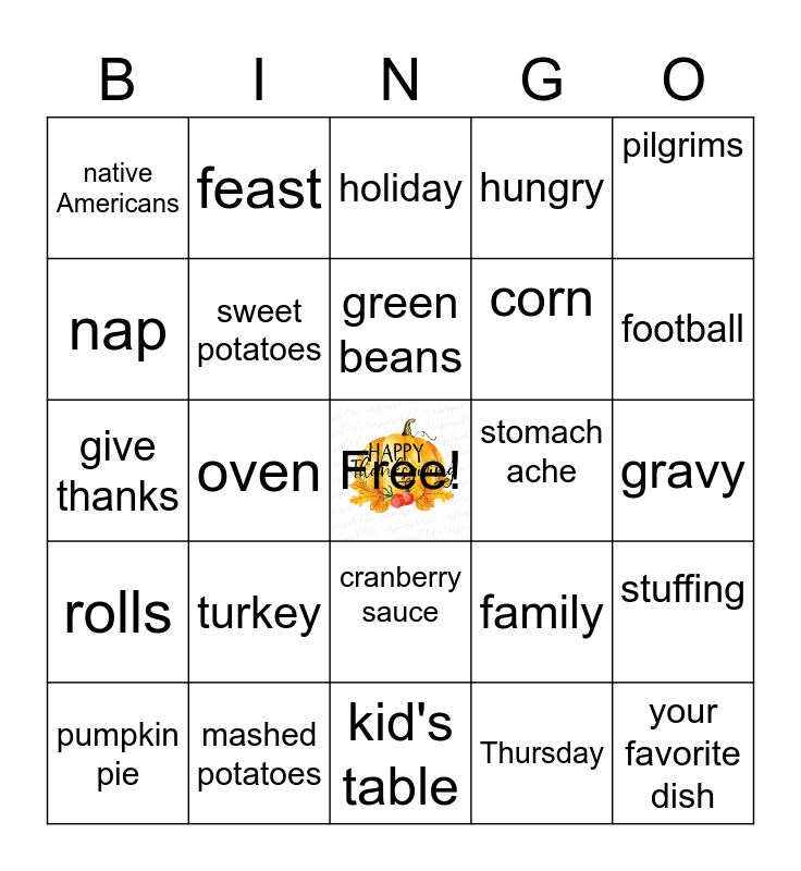 This bingo card has a free space and 24 words: turkey, mashed potatoes, green beans, pumpkin pie, pilgrims, native Americans, nap, feast, stomach ache, cranberry sauce, corn, give thanks, family, stuffing, sweet potatoes, Thursday, gravy, holiday, football, oven, your favorite dish, rolls, hungry and kid's table.