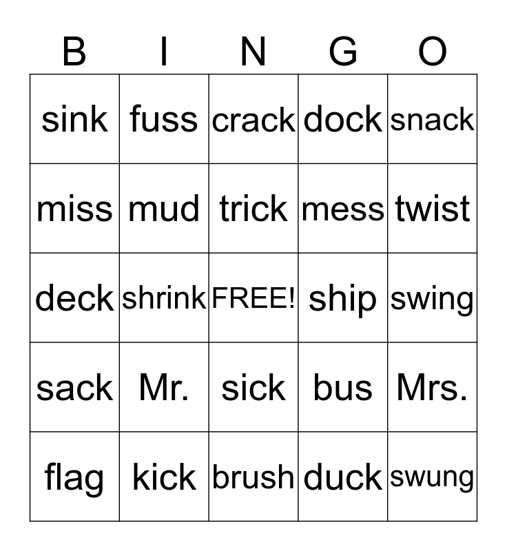 This bingo card has a free space and 31 words: brush, shrug, shrink, plug, sink, crack, mud, bus, ship, duck, swing, swung, shrub, track, twist, dwell, Mrs., Mr., sack, sick, snack, stick, flag, fuss, mess, miss, dock, deck, kick, trick and smash.
