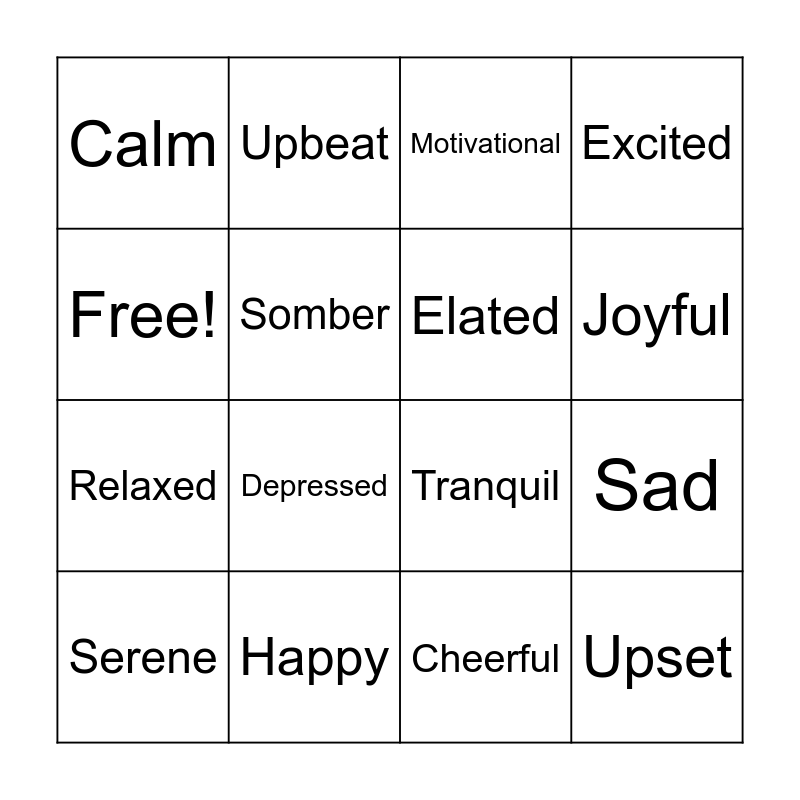 This bingo card has 16 words: Happy, Sad, Motivational, Calm, Relaxed, Upbeat, Tranquil, Cheerful, Free!, Somber, Serene, Excited, Depressed, Joyful, Elated and Upset.