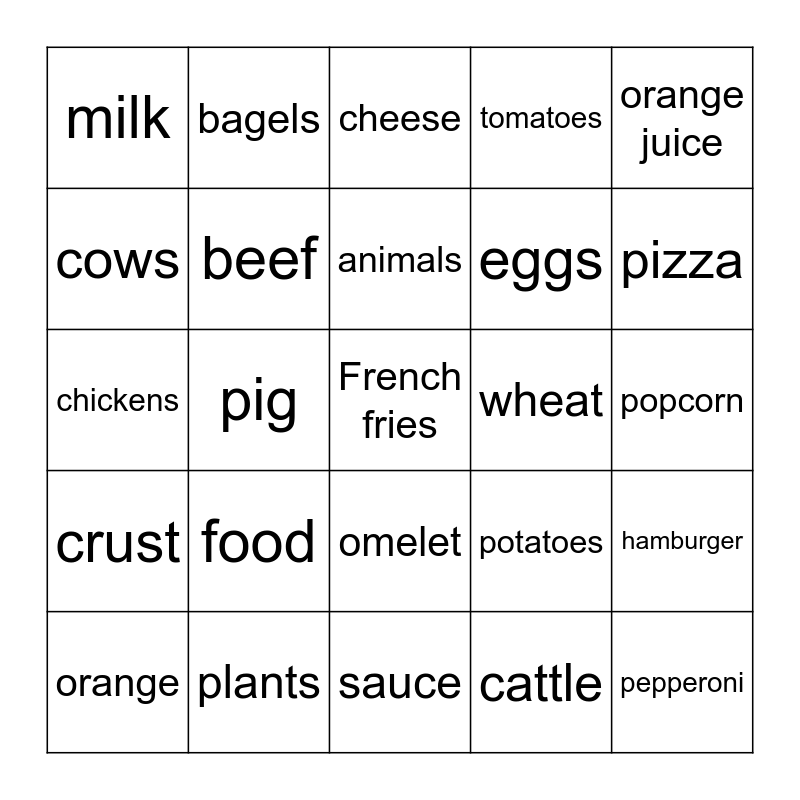 This bingo card has a free space and 24 words: food, plants, animals, orange, orange juice, milk, cows, bagels, wheat, omelet, eggs, chickens, potatoes, hamburger, beef, cattle, popcorn, cheese, pizza, pig, pepperoni, crust, tomatoes and sauce.