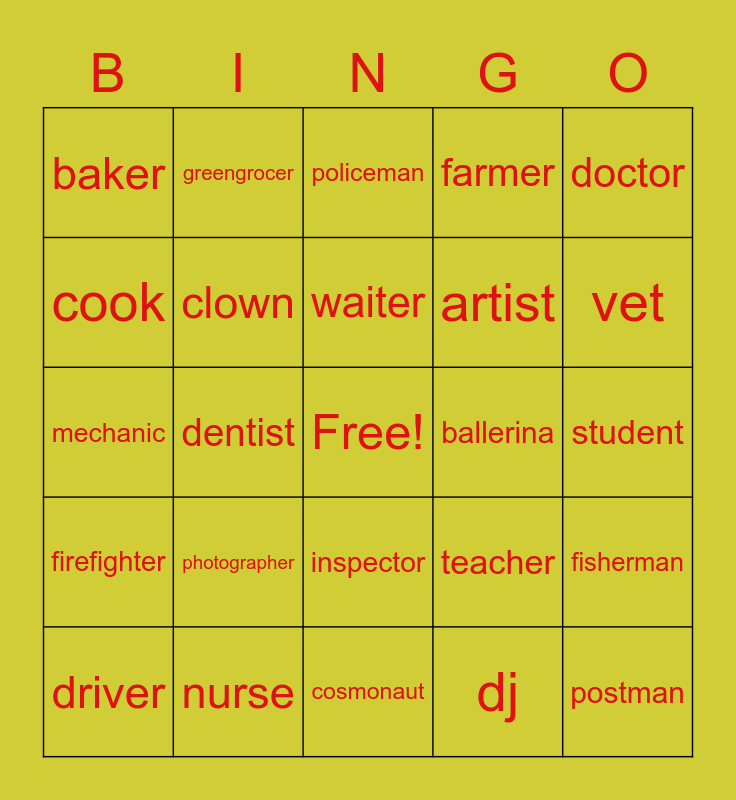 This bingo card has a free space and 26 words: inspector, dj, waiter, nurse, doctor, baker, cook, greengrocer, student, teacher, artist, mechanic, fisherman, driver, dentist, pilot, farmer, firefighter, policeman, postman, vet, cosmonaut, ballerina, photographer, clown and magician.