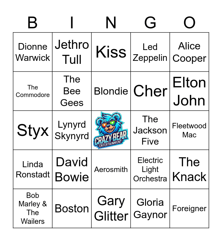 This bingo card has a free space and 37 words: Nazareth, Deep Purple, Blue Oyster Cult, The Bee Gees, The Knack, David Bowie, Blondie, Rush, Alice Cooper, Chicago, Lynyrd Skynyrd, Led Zeppelin, Foreigner, Fleetwood Mac, The Commodore, Linda Ronstadt, Carly Simon, Kiss, Aerosmith, The Jackson Five, Dionne Warwick, Elton John, Bob Marley & The Wailers, Gary Glitter, Kansas, Gloria Gaynor, Jethro Tull, Cheap Trick, The Who, Pink Floyd, The Eagles, Boston, Styx, Queen, Electric Light Orchestra, Cher and Bay City Rollers.