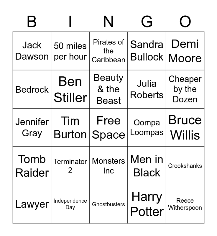 This bingo card has a free space and 24 words: Terminator 2, Independence Day, Beauty & the Beast, Lawyer, Demi Moore, Jack Dawson, Bedrock, 50 miles per hour, Oompa Loompas, Monsters Inc, Julia Roberts, Jennifer Gray, Men in Black, Crookshanks, Ben Stiller, Harry Potter, Bruce Willis, Pirates of the Caribbean, Cheaper by the Dozen, Tim Burton, Reece Witherspoon, Tomb Raider, Sandra Bullock and Ghostbusters.