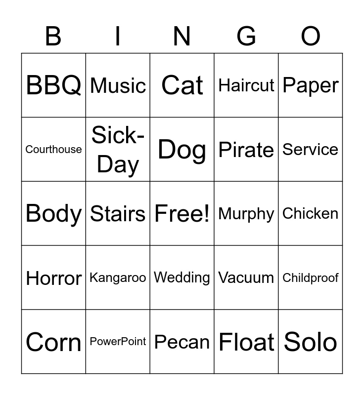 This bingo card has a free space and 55 words: Noodle, Corn, Pepper, BBQ, Pecan, Pizza, Sick-Day, Hulk, Pirate, Invention, Haircut, Beehive, Gym, Smith, Shoe, Office, Paper, Stairs, Book, Solo, Murphy, Hippie, Vacuum, Cat, Witch, Dog, Float, Towel, Chicken, Childproof, Cheese, Melon, Mobster, Bear, Courthouse, Body, Herb, Horror, Steak, Fast, Music, Calm, Atom, Leopard, Kangaroo, PowerPoint, Laptop, Elsa, Coach, Service, Friends, Toddler, Night, Wedding and Balloon.
