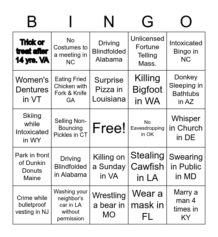 This bingo card has a free space and 24 words: Driving Blindfolded in Alabama, Washing your neighbor's car in LA without permission, Surprise Pizza in Louisiana, Crime while bulletproof vesting in NJ, Intoxicated Bingo in NC, Trick or treat after 14 yrs. VA, Women's Dentures in VT, No Costumes to a meeting in NC, No Eavesdropping in OK, Killing on a Sunday in VA, Killing Bigfoot in WA, Skiing while Intoxicated in WY, Stealing Cawfish in LA, Swearing in Public in MD, Eating Fried Chicken with Fork & Knife GA, Wear a mask in FL, Whisper in Church in DE, Driving Blindfolded Alabama, Donkey Sleeping in Bathtubs in AZ, Selling Non-Bouncing Pickles in CT, Marry a man 4 times in KY, Park in front of Dunkin Donuts Maine, Unlicensed Fortune Telling Mass. and Wrestling a bear in MO.