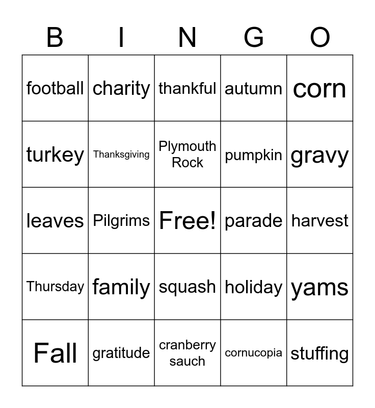 This bingo card has a free space and 24 words: family, gratitude, Plymouth Rock, Fall, corn, football, turkey, charity, parade, squash, pumpkin, leaves, holiday, yams, Thanksgiving, cornucopia, harvest, thankful, gravy, Pilgrims, stuffing, Thursday, autumn and cranberry sauch.