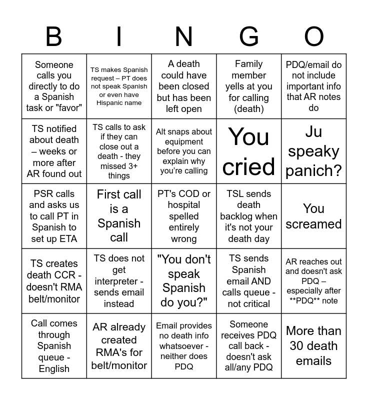 This bingo card has 30 words: AR already created RMA's for belt/monitor, PDQ has "No" checked off - then notes say "unsure", First call is a Spanish call, PT not wearing but almost whole PDQ is filled out, Someone calls you directly to do a Spanish task or "favor", A death could have been closed but has been left open, TS calls to ask if they can close out a death - they missed 3+ things, "You don't speak Spanish do you?", TSL sends death backlog when it's not your death day, Email provides no death info whatsoever - neither does PDQ, You screamed, PT's COD or hospital spelled entirely wrong, Someone receives PDQ call back - doesn't ask all/any PDQ, More than 30 death emails, Ju speaky panich?, You have to interpret the entire PSR visit, TS sends Spanish email AND calls queue - not critical, TS creates death CCR - doesn't RMA belt/monitor, TS does not get interpreter - sends email instead, PDQ/email do not include important info that AR notes do, PSR calls and asks us to call PT in Spanish to set up ETA, Another dept asks “Can’t you just stay on the line?”, TS makes Spanish request – PT does not speak Spanish or even have Hispanic name, You cried, TS notified about death – weeks or more after AR found out, Family member yells at you for calling (death), AR reaches out and doesn't ask PDQ – especially after **PDQ** note, Call comes through Spanish queue - English, Alt snaps about equipment before you can explain why you’re calling and 3 or more attempts failed to reach someone at a PR hospital.