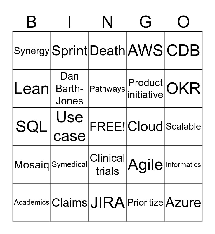 This bingo card has a free space and 39 words: Feature, User story, Pipeline, Dan Barth-Jones, Academics, Clinical trials, Pathways, Life Sciences Portal, CDB, Mosaiq, Use case, AWS, Azure, Scalable, Cloud, Symedical, Blocks, Synergy, Dashboard, Agile, Lean, JIRA, Product initiative, OKR, Abstraction, Strategy, Deliverable, Roadmap, Bug, Sprint, De-identification, PHI, Death, Claims, Prioritize, Customer, Informatics, SQL and Tableau.