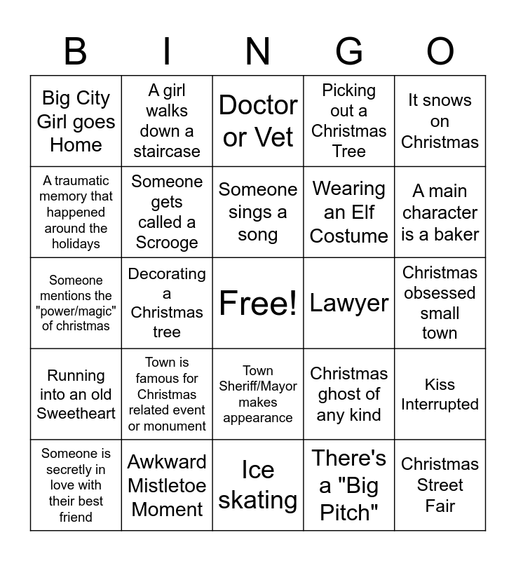 This bingo card has a free space and 60 words: Mysterious Magical Old Man, Awkward Mistletoe Moment, Future Holiday Flash Forward/flashback, Running into an old Sweetheart, There's a "Big Pitch", Baking Cookies, Someone gets called a Scrooge, Christmas themed Game Night, Wearing an Elf Costume, Snowball Fight, Picking out a Christmas Tree, A Proposal, A traumatic memory that happened around the holidays, Gift Donations/Toy Drive, Someone is royalty, Big City Girl goes Home, Christmas Street Fair, It snows on Christmas, Holiday Competiton, Someone sings a song, Lawyer, Doctor or Vet, Someone is secretly in love with their best friend, Kiss Interrupted, Mall Santa, Corporate Grinch, Enemies to Lovers Trope, Someone is secretly royalty, A main character is a baker, Someone is a widow, Reference to a Christmas miracle, Single mom/dad, A family business is in trouble, A stumble or fall turns romantic, A girl walks down a staircase, The movie stars an early 2000s has been, A carriage ride, Decorating a Christmas tree, Ugly Christmas sweater party, Someone mentions the "power/magic" of christmas, Professionally Decorated House, Town is famous for Christmas related event or monument, Christmas obsessed small town, Time traveling, Christmas ghost of any kind, Best friend sets up a date or tells them to get back out there, Wedding planner, Snowstorm causes chaos, Kid wants mom/dad to find love, Town Sheriff/Mayor makes appearance, Ice skating, Snow angels/building a snowman, Someone gets promoted, Scene set in a cafe, There's a Christmas crime, Independently wealthy person has a job for fun, Destination Christmas, Christmas Pregnancy, Mother that could be sister and Extreme botox syndrome.