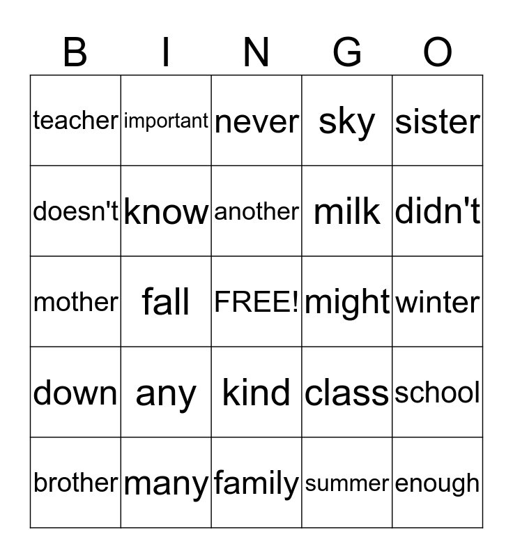 This bingo card has a free space and 24 words: any, many, another, brother, sister, teacher, doesn't, important, might, kind, milk, mother, class, school, know, summer, winter, never, didn't, fall, enough, down, sky and family.