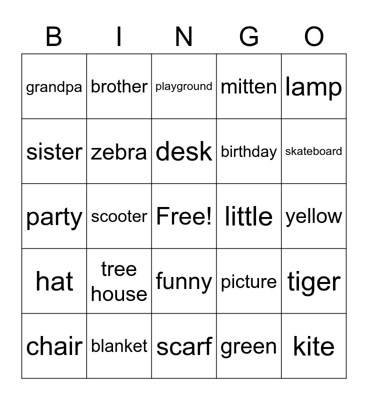 This bingo card has a free space and 24 words: tree house, blanket, desk, chair, lamp, grandpa, sister, brother, little, funny, birthday, party, picture, tiger, zebra, green, yellow, playground, skateboard, scooter, kite, hat, mitten and scarf.
