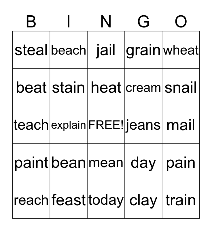This bingo card has a free space and 24 words: bean, feast, heat, reach, wheat, steal, beat, beach, jeans, mean, cream, teach, day, pain, stain, clay, mail, jail, snail, explain, train, paint, grain and today.