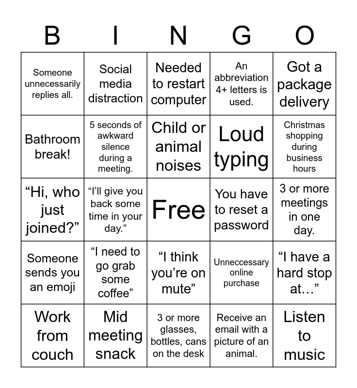 This bingo card has 40 words: “Can you hear me?”, “Hi, who just joined?”, A power point is used., 5 seconds of awkward silence during a meeting., Mid meeting snack, “I think you’re on mute”, Child or animal noises, You receive an out of office reply., Got a package delivery, Someone sends you an emoji, “I’ll give you back some time in your day.”, An abbreviation 4+ letters is used., Free, 3 or more meetings in one day., You have to reset a password, “I need to go grab some coffee”, Someone screen shares, Someone unnecessarily replies all., Only one person has their camera on., Needed to restart computer, “I have a hard stop at…”, Receive an email with a picture of an animal., Loud typing, Bathroom break!, You get an Urgent email., Internet kicks you off., Laundry break, Small talk waiting for all attendees., Listen to music, Head hunter message/email, Work from bed., Work from couch, Got dressed for the day, Unneccessary online purchase, Christmas shopping during business hours, 3 or more glasses, bottles, cans on the desk, Actually brushed your hair., Same shirt as yesterday, Social media distraction and Involved in confusing email thread.