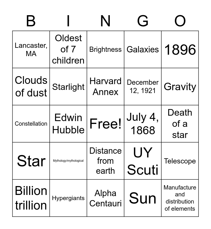 This bingo card has a free space and 37 words: Period-luminosity relationship, Bending light, Atmospheric refraction, Starlight, Telescope, Mythology/mythological, Harvard Annex, Mathematics, 1896, 1902, Edwin Hubble, Galaxies, Manufacture and distribution of elements, Death of a star, Clouds of dust, Star, Cepheid Variable, Brightness, Distance from earth, July 4, 1868, Lancaster, MA, Gravity, Billion trillion, Alpha Centauri, Light-years, Sun, Oldest of 7 children, Cambridge, Nebula, Protostar, Gas, Hypergiants, Constellation, Plasma, UY Scuti, December 12, 1921 and Leavitt’s Law.