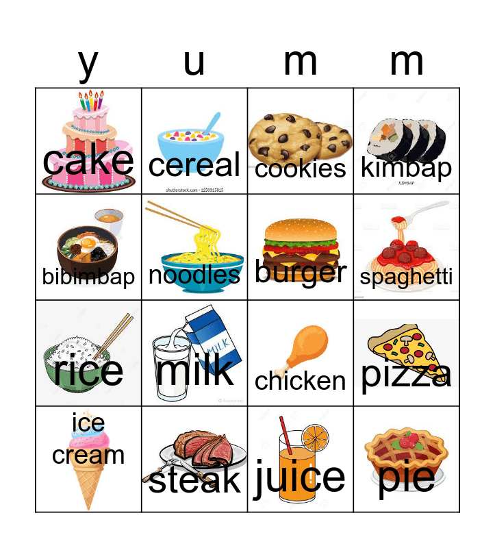 This bingo card has 16 images and 16 words: steak, pizza, cookies, cake, rice, cereal, chicken, juice, bibimbap, noodles, ice cream, kimbap, milk, spaghetti, burger and pie.