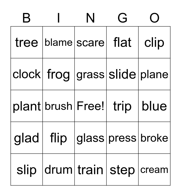 This bingo card has a free space and 24 words: flip, drum, grass, slip, clip, tree, clock, blame, trip, glass, slide, plant, press, broke, frog, step, blue, scare, plane, brush, cream, glad, flat and train.