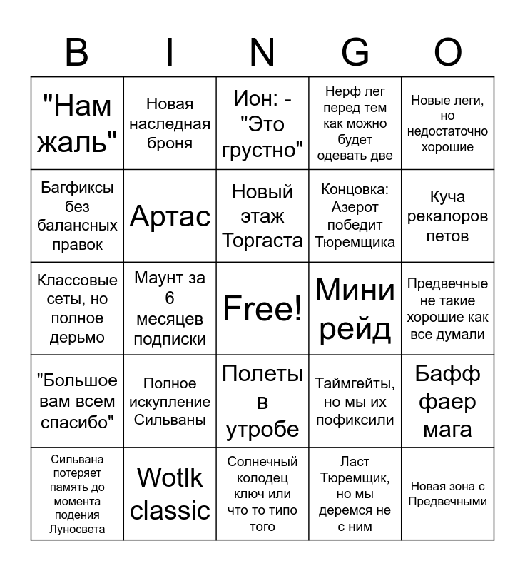 This bingo card has a free space and 24 words: Сильвана потеряет память до момента подения Луносвета, Полное искупление Сильваны, Новый этаж Торгаста, Ласт Тюремщик, но мы деремся не с ним, Новые леги, но недостаточно хорошие, "Нам жаль", Новая наследная броня, Ион: -"Это грустно", Мини рейд, Предвечные не такие хорошие как все думали, Классовые сеты, но полное дерьмо, Артас, Таймгейты, но мы их пофиксили, Бафф фаер мага, Багфиксы без балансных правок, Wotlk classic, Солнечный колодец ключ или что то типо того, Нерф лег перед тем как можно будет одевать две, Куча рекалоров петов, "Большое вам всем спасибо", Маунт за 6 месяцев подписки, Полеты в утробе, Концовка: Азерот победит Тюремщика and Новая зона с Предвечными.