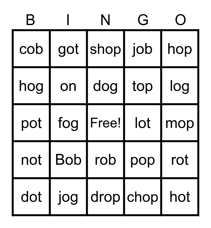 This bingo card has a free space and 24 words: Bob, jog, dog, dot, hop, cob, hog, got, lot, rob, top, pot, pop, rot, on, chop, mop, shop, log, fog, hot, not, job and drop.