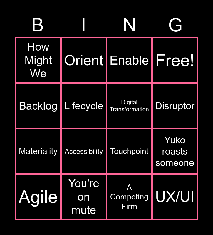 This bingo card has 20 words: Yuko roasts someone, Toolkit, Enable, Codify, Agile, Backlog, You're on mute, How Might We, Materiality, Orient, Accessibility, Touchpoint, Lifecycle, UX/UI, Digital Transformation, Prioritization, Disruptor, Free!, A Competing Firm and Abram gets excited in the chat.