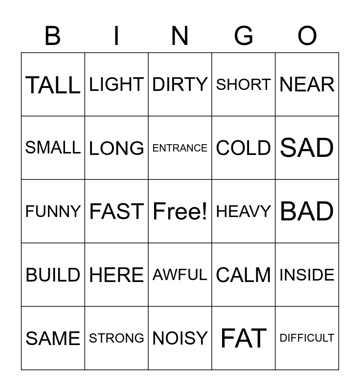 This bingo card has a free space and 29 words: SAME, CLOSED, FAST, LIGHT, TALL, DIRTY, LONG, HERE, HEAVY, STRONG, BAD, DIFFICULT, NOISY, FAT, SAD, CRY, AWFUL, BUILD, NEAR, FUNNY, CALM, SHALLOW, COLD, SMALL, SHORT, LIGHT, INSIDE, ENTRANCE and MALE.