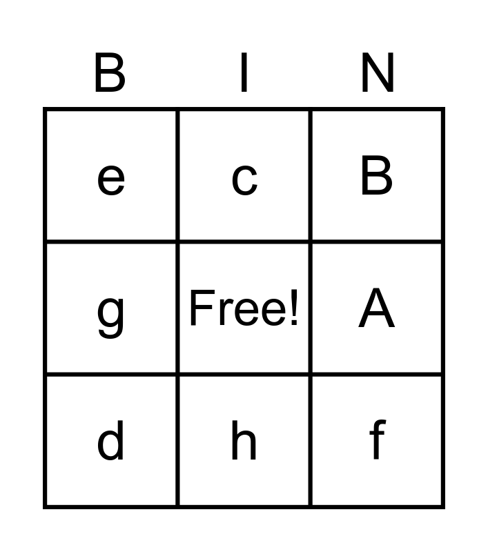 This bingo card has a free space and 8 words: A, B, c, d, e, f, g and h.