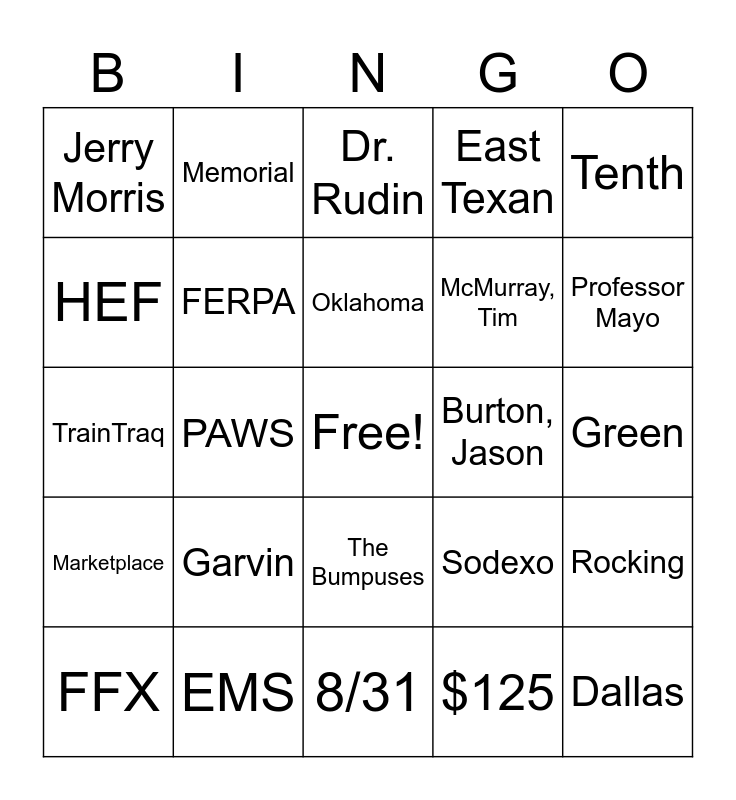 This bingo card has a free space and 88 words: Twice, North Pole, The Bumpuses, Home Alone, Bells, New York, Angel, Sugar Plums, Coca-Cola, Cookies, Frosty's, Nine, Rocking, Green, Ebenezer, Oklahoma, Blue, The Nutcracker, WorkDay, Mane Market, Whitley, UPD, TrainTraq, Title IX, $125, 1889, 1996, $10,000, Bub McDowell, Budget Group Users, Dr. Rudin, East Texan, Encumbrance, Ernest Hawkins, Garvin, HEF, Jerry Morris, Keith McFarland, Sam Rayburn, Professor Mayo, PAWS, PAC, Lion, Sodexo, Burton, Jason, Rosenburg,Jaret, Case, Craig, Bailiff, David, Piper, Neil, McMurray, Tim, Hayek, Mario, Humphreys, John, Harp, Randy, KETR, Donham, Brent, 11, Marketplace, Memorial, Safe Harbor, Receiving, Prompt Pay, No, Concur, DBR, DCR, EMS, FAMIS, FERPA, FFX, Dallas, FRS, Sharp, John, Staff Council, Tenth, $500, 1700, 1900, 3000, 8/31, 9/1, >$2,500, 3 Business Days, A Travel Request, Advancement Services, Tina Livingston, Canopy, CASCADE and Southland.