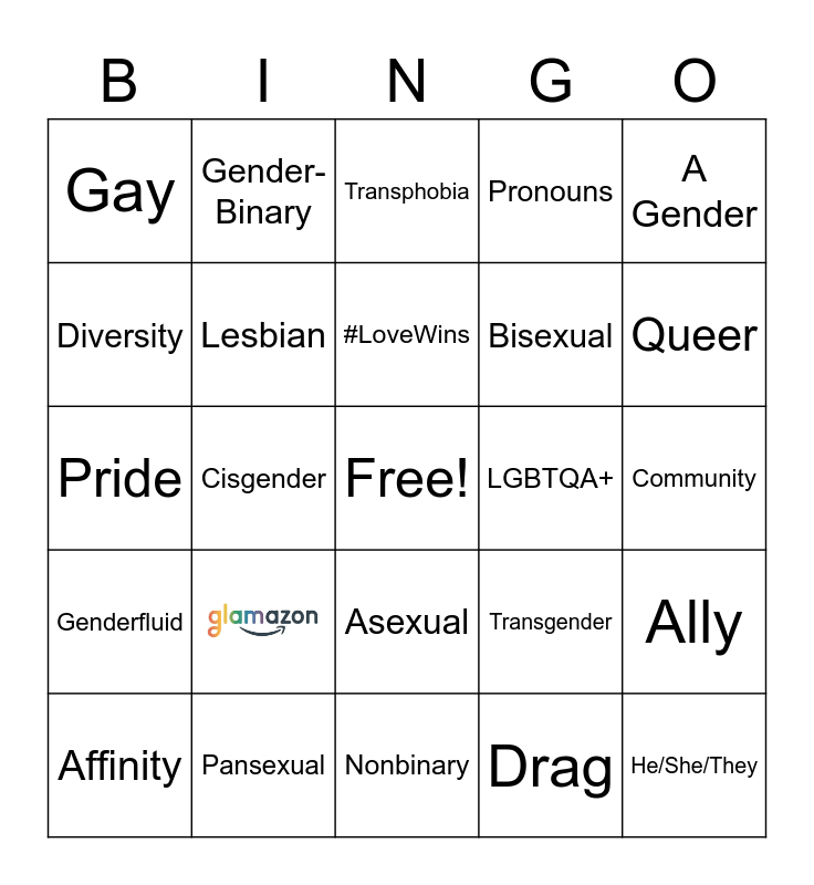 This bingo card has 1 images, a free space and 23 words: Pansexual, #LoveWins, Affinity, A Gender, Gay, Diversity, Gender-Binary, LGBTQA+, Asexual, Bisexual, Pride, Transgender, Ally, Lesbian, Drag, Community, Transphobia, Queer, Cisgender, He/She/They, Genderfluid, Pronouns and Nonbinary.