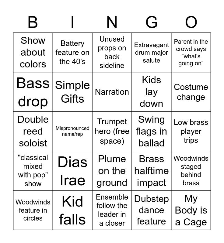 This bingo card has a free space and 24 words: Dias Irae, Kid falls, Narration, Woodwinds feature in circles, Parent in the crowd says "what's going on", Show about colors, Bass drop, Battery feature on the 40's, Swing flags in ballad, Plume on the ground, Kids lay down, Double reed soloist, Brass halftime impact, Woodwinds staged behind brass, Simple Gifts, Dubstep dance feature, Low brass player trips, Unused props on back sideline, Costume change, Mispronounced name/rep, My Body is a Cage, "classical mixed with pop" show, Extravagant drum major salute and Ensemble follow the leader in a closer.