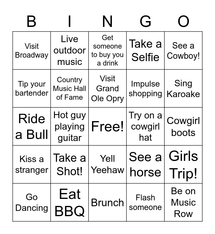 This bingo card has a free space and 24 words: Take a Shot!, Eat BBQ, Visit Grand Ole Opry, Go Dancing, See a Cowboy!, Visit Broadway, Tip your bartender, Live outdoor music, Try on a cowgirl hat, Yell Yeehaw, Impulse shopping, Ride a Bull, See a horse, Girls Trip!, Country Music Hall of Fame, Flash someone, Cowgirl boots, Get someone to buy you a drink, Sing Karoake, Hot guy playing guitar, Be on Music Row, Kiss a stranger, Take a Selfie and Brunch.
