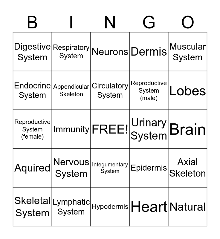 This bingo card has a free space and 24 words: Nervous System, Lymphatic System, Circulatory System, Skeletal System, Muscular System, Digestive System, Endocrine System, Respiratory System, Urinary System, Integumentary System, Reproductive System (male), Reproductive System (female), Epidermis, Axial Skeleton, Appendicular Skeleton, Heart, Brain, Neurons, Lobes, Immunity, Natural, Aquired, Dermis and Hypodermis.