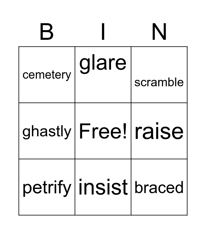 This bingo card has a free space and 11 words: cluster, insist, braced, petrify, glare, scramble, raise, prospect, ghastly, cemetery and spine-chilling.