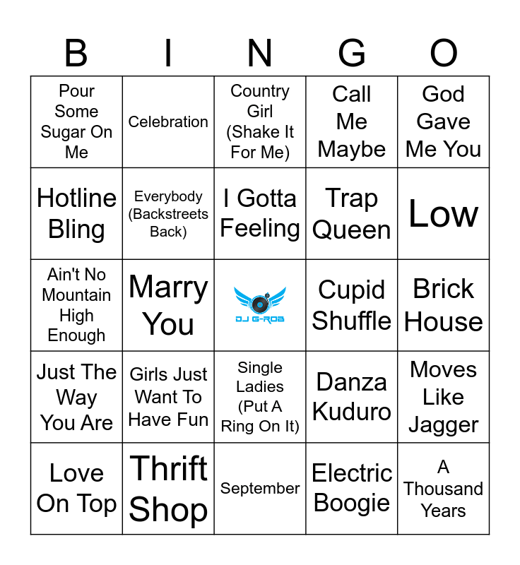 This bingo card has a free space and 39 words: You Shook Me All Night Long, Hey Ya!, Love Shack, Everybody (Backstreets Back), Love On Top, Single Ladies (Put A Ring On It), I Gotta Feeling, No Diggity, God Gave Me You, Just The Way You Are, Marry You, Call Me Maybe, A Thousand Years, Brick House, Cupid Shuffle, Girls Just Want To Have Fun, Wagon Wheel, Pour Some Sugar On Me, Turn Down For What, Danza Kuduro, Hotline Bling, September, Trap Queen, Low, Mas Macarena, Jump Around, All of Me, SexyBack, Footloose, Celebration, Party Rock Anthem, Shots, Country Girl (Shake It For Me), Thrift Shop, Electric Boogie, Uptown Funk, Moves Like Jagger, Ain't No Mountain High Enough and U Can't Touch This.
