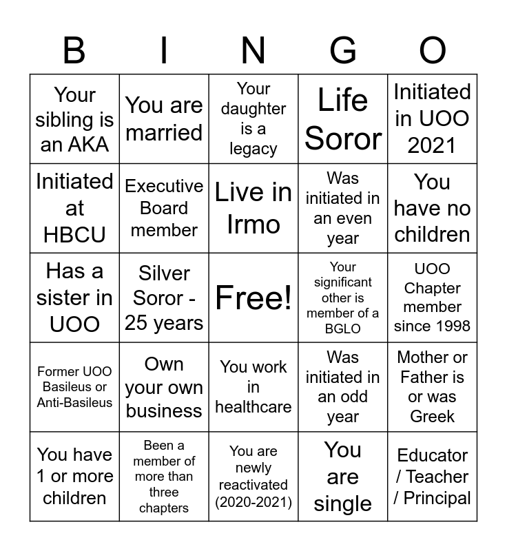 This bingo card has a free space and 37 words: Favorite color is pink, Favorite color is green, Board member of IHF, Executive Board member, Mother or Father is or was Greek, Own your own business, Live in Irmo, Live in North East, Initiated in UOO 2021, Charter member, Silver Soror - 25 years, Life Soror, Educator / Teacher / Principal, UOO Chapter member since 1998, Initiated at HBCU, Former UOO Basileus or Anti-Basileus, You are a legacy, Your daughter is a legacy, You work in healthcare, Your significant other is member of a BGLO, Your sibling is an AKA, You have no children, You have 1 or more children, You are newly reactivated (2020-2021), AKA for 30 years, You are single, You are married, New to SC 2 years or less, Active or retired military, The only AKA in your family, Has an AKA license plate on her car, Been a member of more than three chapters, Has a sister in UOO, Held a chapter office in last 5 years, Was initiated in an odd year, Was initiated in an even year and Belong to another Service Org.