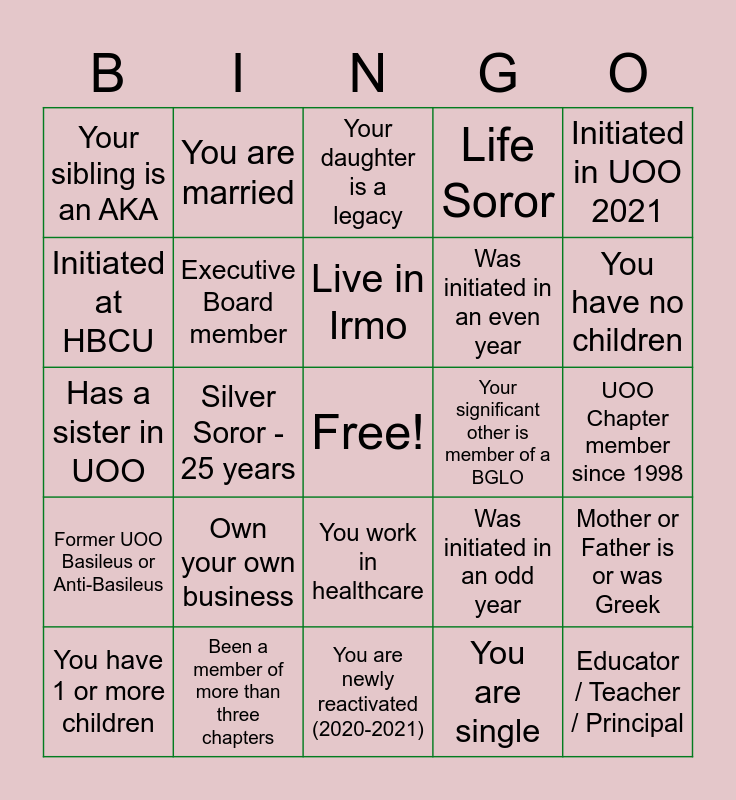 This bingo card has a free space and 37 words: Favorite color is pink, Favorite color is green, Board member of IHF, Executive Board member, Mother or Father is or was Greek, Own your own business, Live in Irmo, Live in North East, Initiated in UOO 2021, Charter member, Silver Soror - 25 years, Life Soror, Educator / Teacher / Principal, UOO Chapter member since 1998, Initiated at HBCU, Former UOO Basileus or Anti-Basileus, You are a legacy, Your daughter is a legacy, You work in healthcare, Your significant other is member of a BGLO, Your sibling is an AKA, You have no children, You have 1 or more children, You are newly reactivated (2020-2021), AKA for 30 years, You are single, You are married, New to SC 2 years or less, Active or retired military, The only AKA in your family, Has an AKA license plate on her car, Been a member of more than three chapters, Has a sister in UOO, Held a chapter office in last 5 years, Was initiated in an odd year, Was initiated in an even year and Belong to another Service Org.