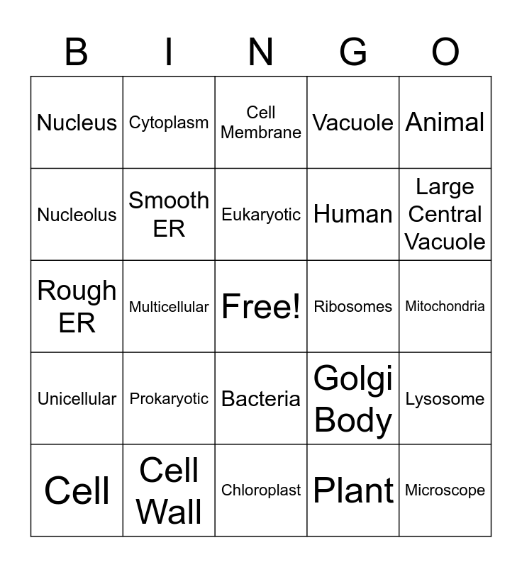 This bingo card has a free space and 24 words: Cell, Prokaryotic, Eukaryotic, Plant, Animal, Nucleus, Cytoplasm, Cell Membrane, Ribosomes, Mitochondria, Rough ER, Smooth ER, Golgi Body, Lysosome, Nucleolus, Cell Wall, Chloroplast, Vacuole, Large Central Vacuole, Unicellular, Multicellular, Bacteria, Human and Microscope.