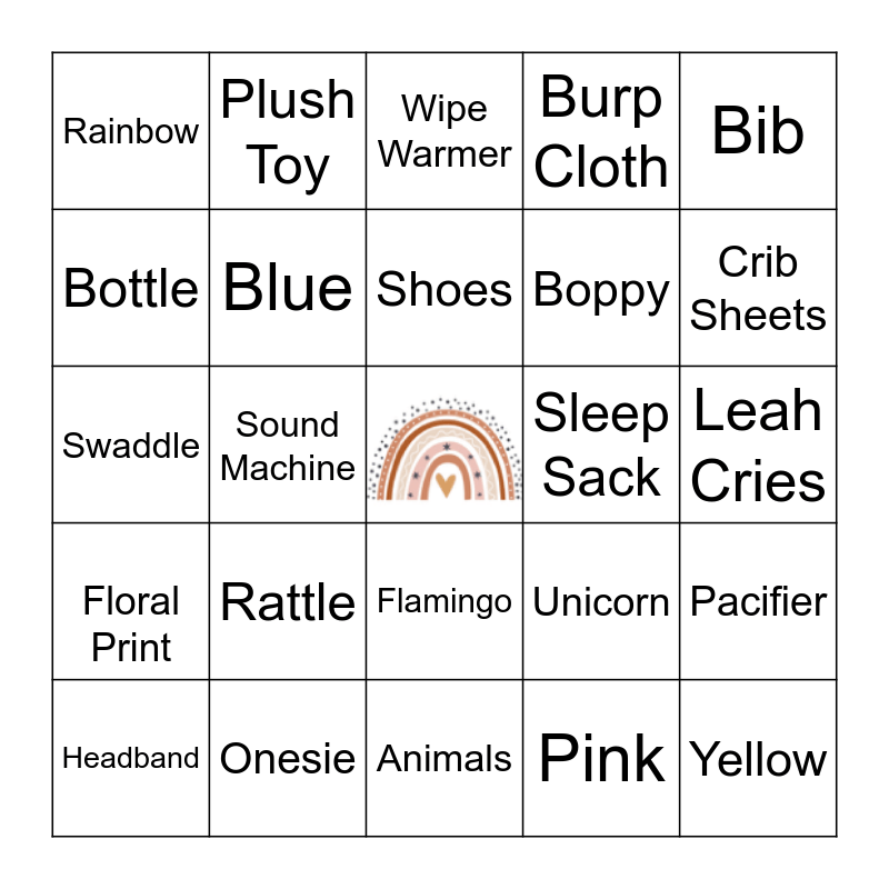 This bingo card has a free space and 24 words: Rattle, Onesie, Shoes, Headband, Bib, Rainbow, Bottle, Plush Toy, Sleep Sack, Flamingo, Boppy, Swaddle, Unicorn, Pacifier, Blue, Pink, Leah Cries, Wipe Warmer, Crib Sheets, Sound Machine, Yellow, Floral Print, Burp Cloth and Animals.