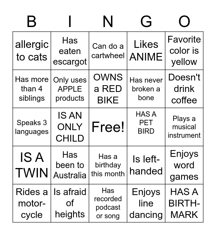This bingo card has a free space and 29 words: Rides a motor- cycle, Can ride a horse, IS AN ONLY CHILD, Cooks or bakes for FUN!, allergic to cats, Can do a cartwheel, Only uses APPLE products, Has been to Australia, HAS A PET BIRD, Is afraid of heights, Plays a musical instrument, HAS A BIRTH-MARK, Has recorded podcast or song, Enjoys line dancing, Doesn't drink coffee, Learned a new skill during quarantine, Has a birthday this month, IS A TWIN, Favorite color is yellow, Speaks 3 languages, Is left-handed, Has a parent who TEACHES, Has never broken a bone, Has more than 4 siblings, Likes ANIME, Has eaten escargot, Enjoys word games, OWNS a RED BIKE and MORNING PERSON.