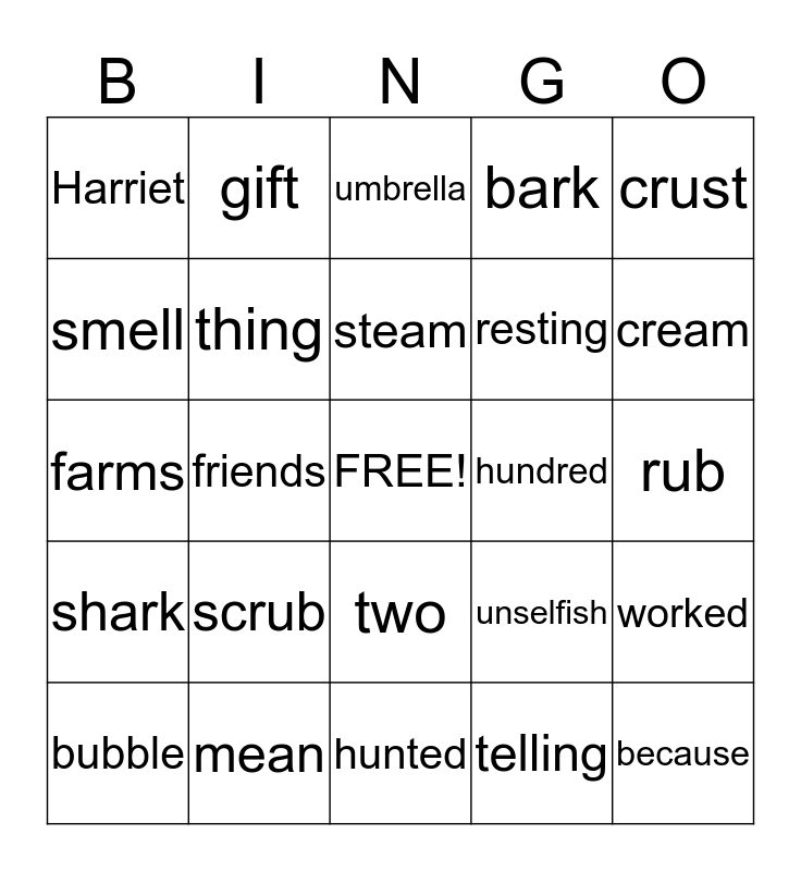 This bingo card has a free space and 24 words: scrub, mean, steam, bubble, crust, Harriet, smell, gift, hundred, two, resting, farms, unselfish, worked, thing, telling, rub, umbrella, cream, friends, because, shark, bark and hunted.