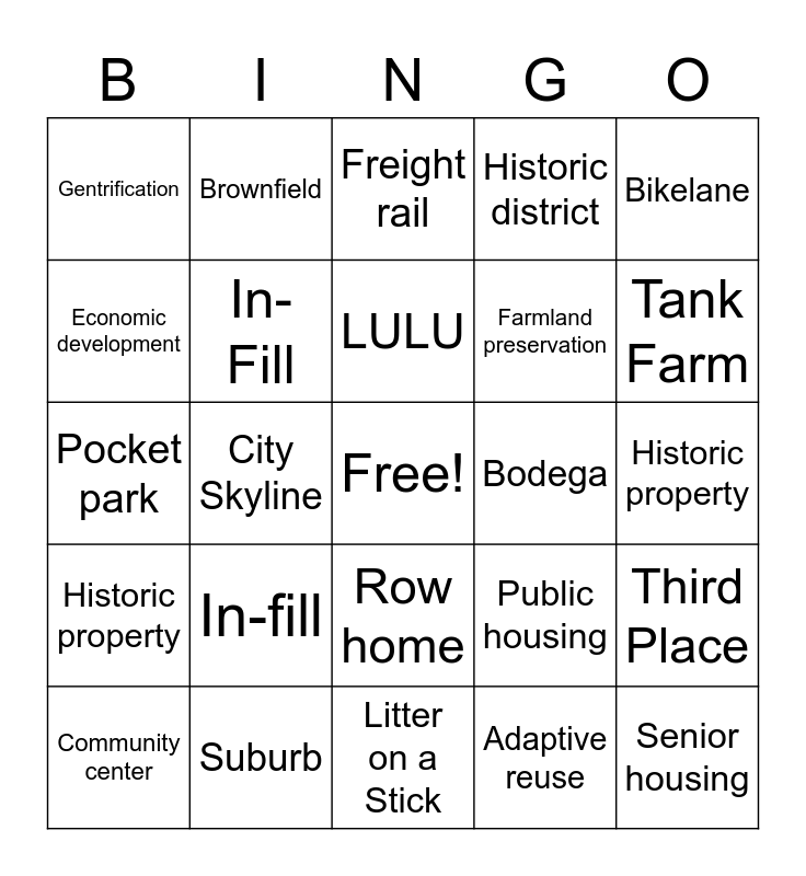 This bingo card has a free space and 32 words: Adaptive reuse, Big-Box Retail, City Skyline, CBD, Historic property, In-Fill, Bikelane, Third Place, Brownfield, Sewage treatment plant, LULU, Freight rail, Light rail, Commuter rail, Bodega, Public school, Community center, Pocket park, Row home, In-fill, Public housing, Mixed-use development, Historic property, Suburb, Senior housing, Historic district, Farmland preservation, Economic development, Gentrification, Litter on a Stick, LULU and Tank Farm.