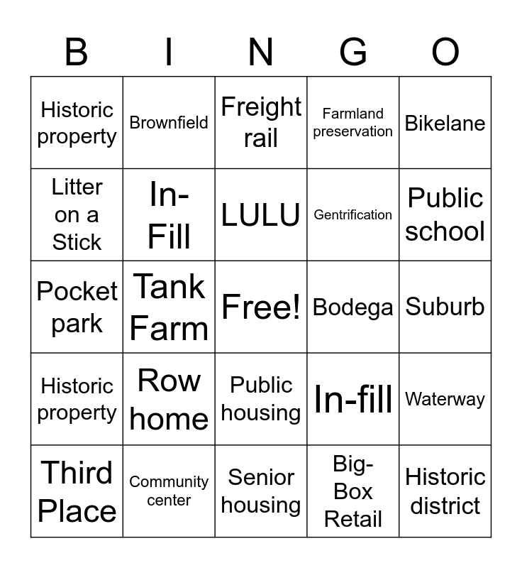 This bingo card has a free space and 34 words: Adaptive reuse, Big-Box Retail, City Skyline, CBD, Historic property, In-Fill, Bikelane, Third Place, Brownfield, Sewage treatment plant, LULU, Freight rail, Light rail, Commuter rail, Bodega, Public school, Community center, Pocket park, Row home, In-fill, Public housing, Mixed-use development, Historic property, Suburb, Senior housing, Historic district, Farmland preservation, Economic development, Gentrification, Litter on a Stick, LULU, Tank Farm, Waterway and Boat.